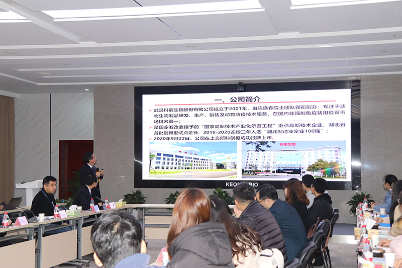 晏向華副院長、王湘如教授、張悅老師詳細介紹了高級獸醫(yī)創(chuàng)制人才班的創(chuàng)立初衷、人才培養(yǎng)模式和教學(xué)目標(biāo)。晏向華指出,高級獸藥創(chuàng)制人才班立足科學(xué)前沿、植根社會需求,旨在為國家培育一批獸醫(yī)藥領(lǐng)域的復(fù)合型人才。他高度評價了華中農(nóng)業(yè)大學(xué)與科前生物長期以來的深入合作,并就“人才班”學(xué)員來司實習(xí)安排與公司展開細致探討。