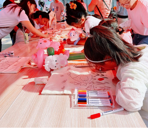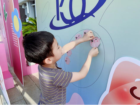 上午八時,家長和孩子們陸續(xù)來到國旗廣場,在簽到處簽到領取游玩卡和小獎品后,便拿著帶有公司特點的小豬異形貼紙去往主題墻簽到并拍照留念。